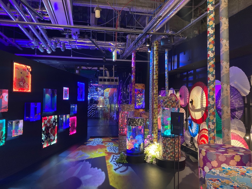 そのとなりに広がるカラフルな空間は「花魁」。円柱形の水槽一つずつに日本の伝統的な模様があしらわれています。白と赤の金魚「さらさ」をはじめ、様々な色の金魚が泳ぐ様は、まるで華やかな羽衣をまとった遊女が歩く花魁道中のよう。