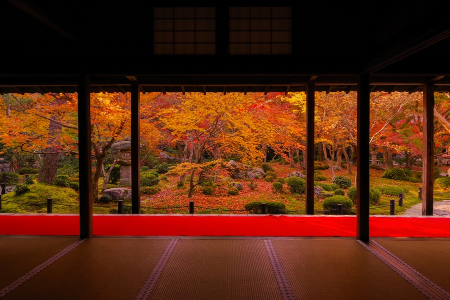 The temple features a stunning strolling pond garden, one of Kyoto's finest, designed by the renowned artist Sōami during the Muromachi period. During the autumn foliage season, the vibrant colors of the maple leaves complement the garden, which represents the world of paradise.