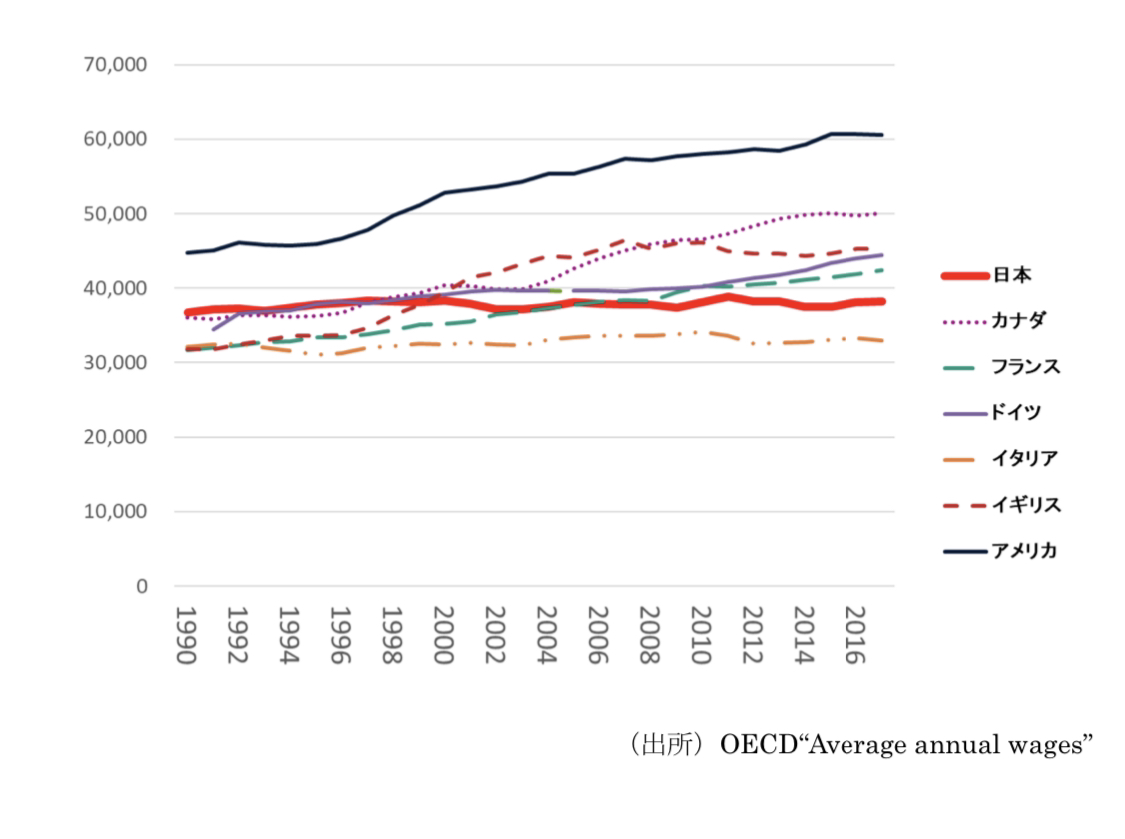 この図は日本・カナダ・フランス・ドイツ・イタリア・イギリス・アメリカの7か国の平均賃金(米ドル換算)を表にしたものです。