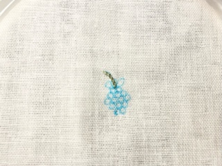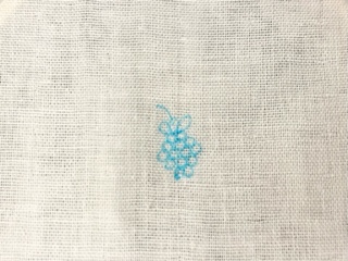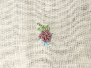ラズベリーの実のつぶつぶ感を表現するために、フレンチノットステッチで刺します。今回は小さな図案なので、1回巻きにしました。一番上の段は2つ横並びに、次の段も3つ、4つと続けたら、今度は3つ、2つと減らしていきます。こうすることで、コロンとした丸い形の実になります。