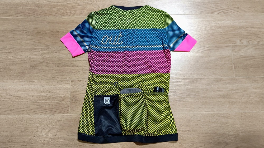 スポーツウェアとの大きな違いは、背中部分にあります。 ロードバイクのライドスタイルの前傾姿勢をとった際に、快適に動ける作りになっています。背中が出ないように後ろが長い丈なのも特徴的です。 少量の荷物は背中にあるポケットに入れられるので、コインケース・スマホなどはこのポケットの中に入れます。リュックを背負うよりも身体への負担が少ないので、荷物をなるべく減らしてこのポケットに収納するのがオススメです。